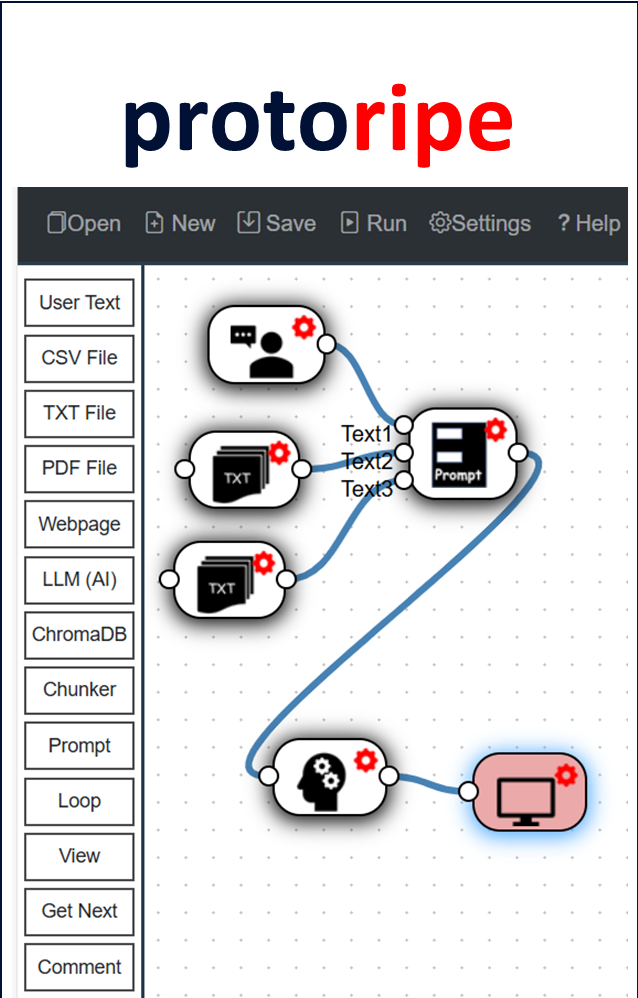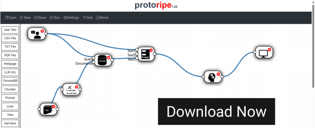 click Here to DOWNLOADBusiness experts Can Now build AI prototypes for BusinessNo coding. Simple drag-n-drop. Usecase Library.Your prototype IP stays with youRun your prototype on your computer, not on someone’s websiteNo need to send confidential data outsideConnect to a local LLM running on your computer or to a 3rd party cloud…We give you flexibility.Opportunities do not wait for prototypingPre-integrations with Data Loaders, Chunkers, Vector Database and Local as well as Cloud-based LLMs.Ready to Transform Your Business?Contact us today to unlock the power of AI for your organization and drive future success.CONTACT US